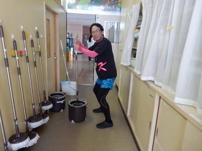 ローリングモップは、バケツに消毒液を入れて、洗浄と脱水をしました。