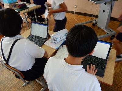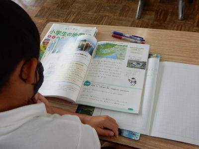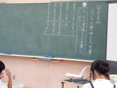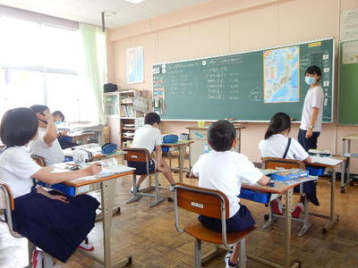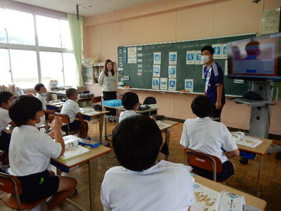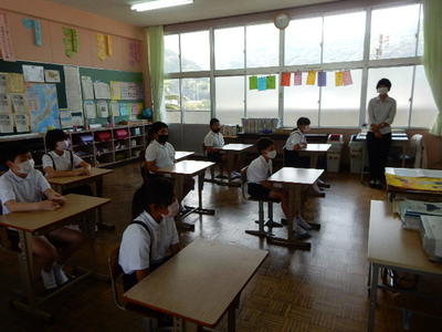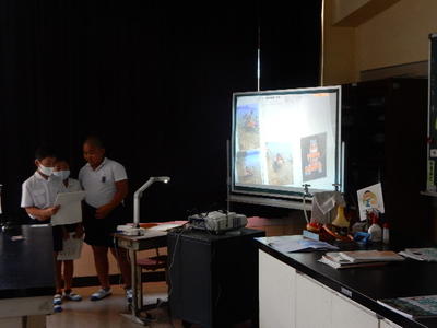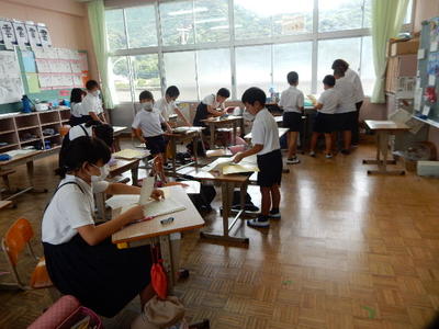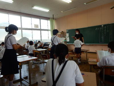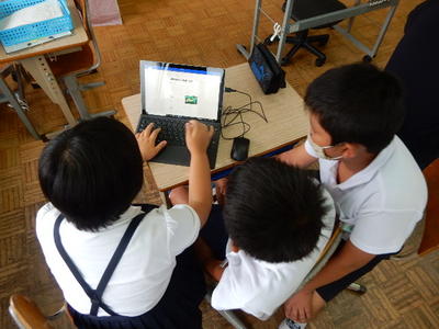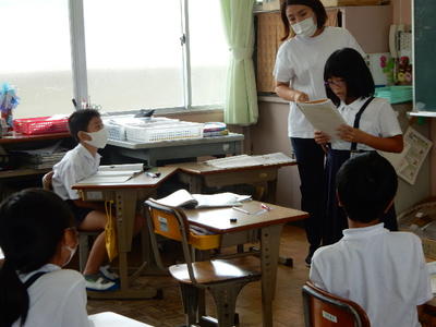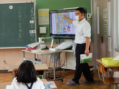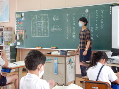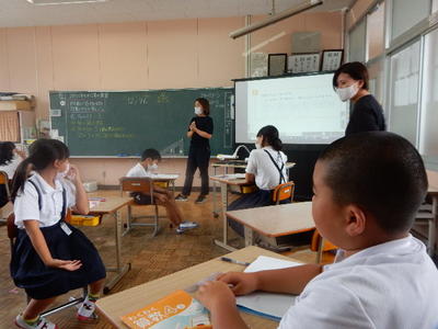 今日は、天草市教育委員会の先生、御所浦中学校の先生、東京からの学生さん(キャラバン隊)が来校されました。2時間目の5年生の国語の授業では、タブレット端末に自分の考えを残しながら、話し合いが行われました。児童は、緊張しながらも話し合いが少しずつ活発になっていく姿が見られました。緊張の中での授業、これも大切な経験です。