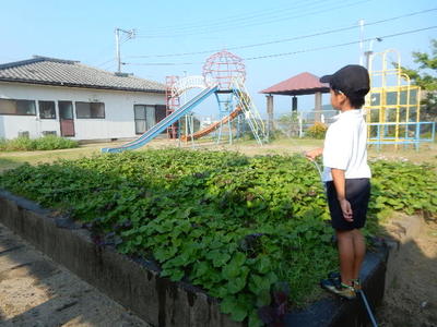 ①について、「フィールドの草を根から抜いてしまえば、きっと運動会まで草は生えない」という仮説を立てて、数日間にわたり、根から除草しました。現在フィールドの4分の1程度です。そして仮説の検証は、「すでに根から除草した部分にもわずか数日で草が生え始めている」・・・!