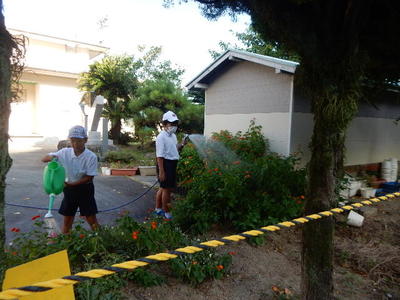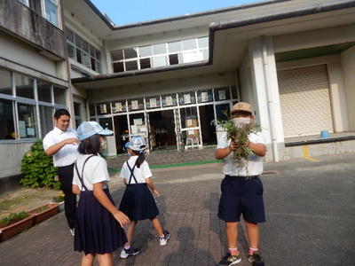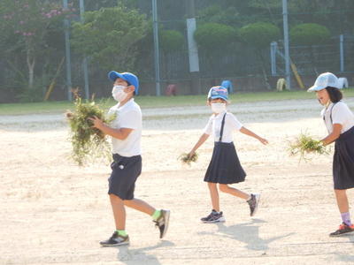 坂瀬先生の話「運動場の見える手洗い場で6年生が『校長先生が草を取っています』と言ってきました。『どうする?』と返すと、『手伝います』と答えたので、バスの出発時刻まで手伝うことになりました。」とのこと。