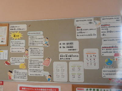 学校は集団生活になるので、今あげたことをしないようにすることが難しい場面があります。そんなときは、マスクの着用、手洗いやうがい、消毒をして、教室の換気、空気の入れ換えをしっかりとするようにしてください。校長先生のお話でもあったように、学校外でもコロナ対策をお願いします。小学生のみなさんがコロナウイルスに感染しても具合が悪くなってひどくなることは少ないそうです。しかし、お年寄りやもともと病気を持っている人はひどくなって死んでしまうこともある病気です。みんなは平気でも大切な人が死んでしまうかもしれない病気を予防するためにしっかりと今できることをしていきましょう。