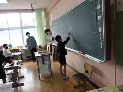 今日は、天草市教育委員会の先生、御所浦中学校の先生、東京からの学生さん(キャラバン隊)が来校されました。2時間目の5年生の国語の授業では、タブレット端末に自分の考えを残しながら、話し合いが行われました。児童は、緊張しながらも話し合いが少しずつ活発になっていく姿が見られました。緊張の中での授業、これも大切な経験です。