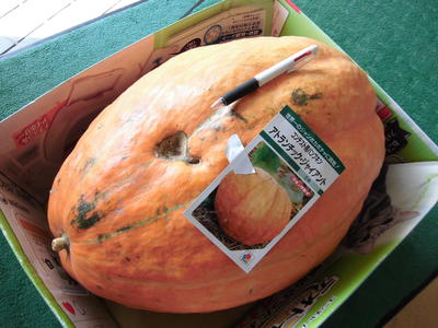大きさを実感していただくためにカボチャにうえにペンを置いています・・・。