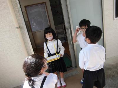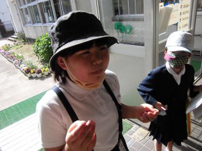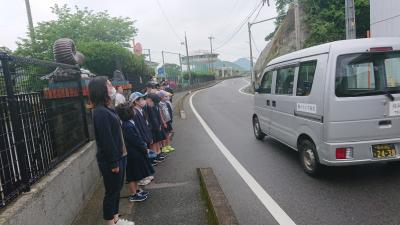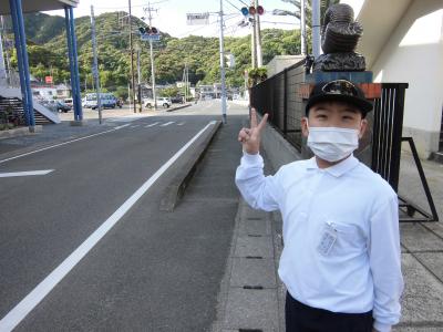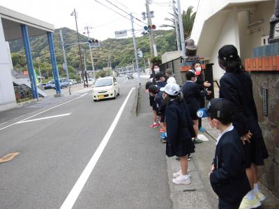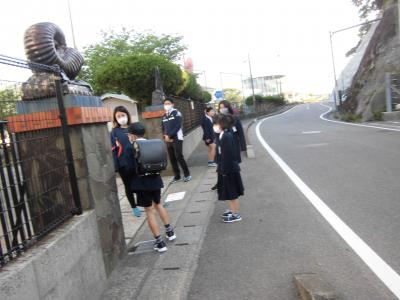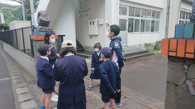 朝はいつものように正門前で地域の皆様へのあいさつをしていると、子どもたちがちらほらとやってきて・・・。