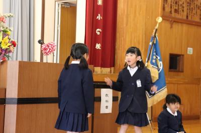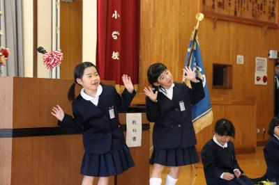 この4つが5年生のころの課題だったので、この4つを意識しながら生活していきたいです。今年1年間は相手のことを考えることを特にがんばりたいです。そして最高学年になるので、学校のリーダーとしていろいろな事に積極的に取り組み、『感謝、笑顔、あいさつがあふれる』御所浦小学校を目指してがんばっていきたいと思います。下級生のみなさん、私たちについてきてください!」