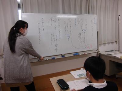 CDの範読と並行して、中村先生は黒板にストーリーをまとめていきます。