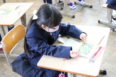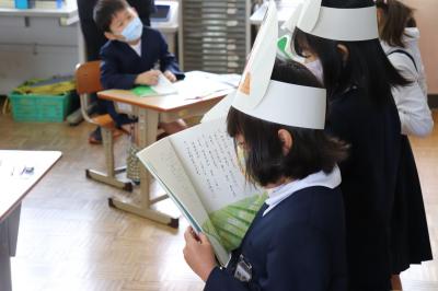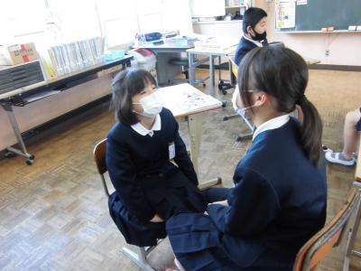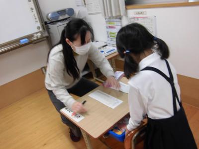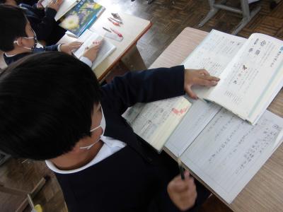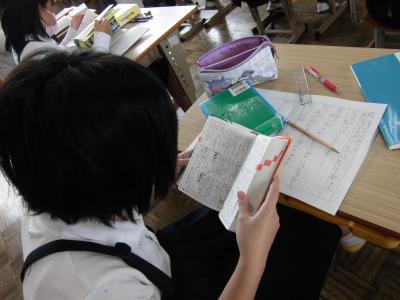 下の写真は6年生のスタートに書いたプロローグを確認に行っています。