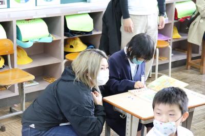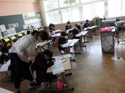 ワークシートへの書き込みが終わると、子どもたちは席を立って友だちの席へ行き、ワークシートの書き込みを見て回ります(ナイス)。