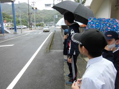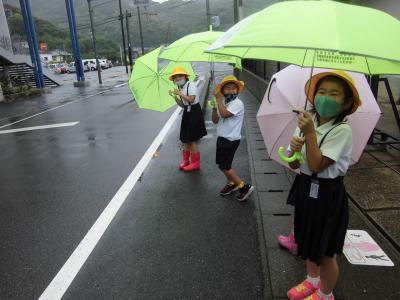 朝、あいさつのため正門前に向かっていると児童玄関前には、先生たちと子どもたち・・・。