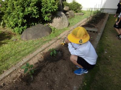 そのころ、1年生と2年生は、荒木さんと田中さんと苗うえでした・・・。