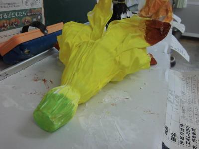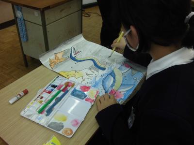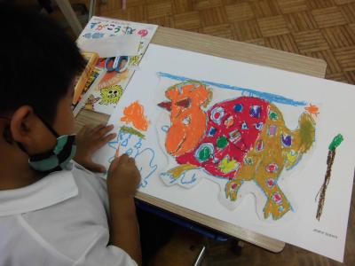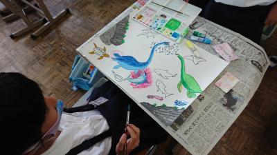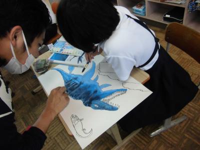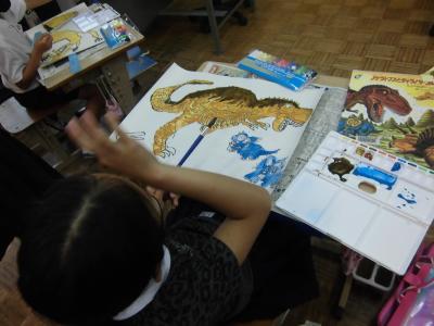 2年生、図工、きょうりゅうの絵・・・。