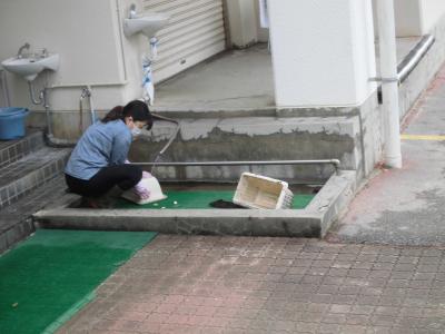正門前で地域のみなさまにあいさつをしていると、中庭から歓声が・・・。