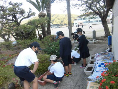 環境委員会、縦割り班で植えたプランターのお世話もありがとう・・・。