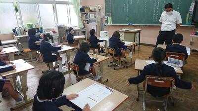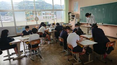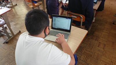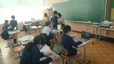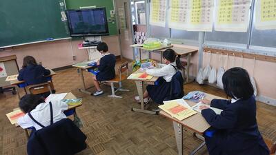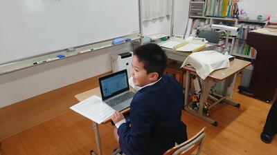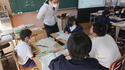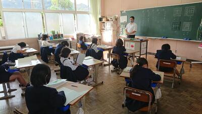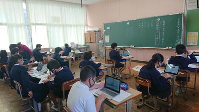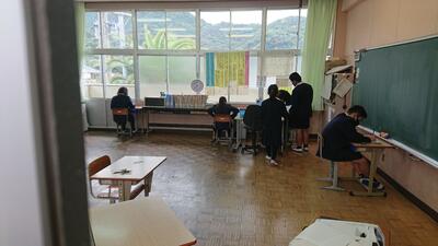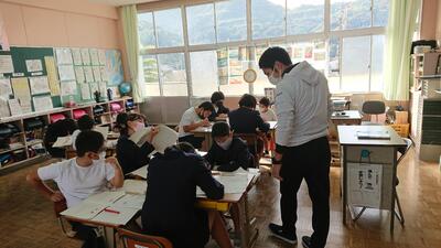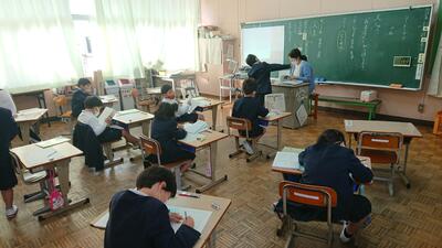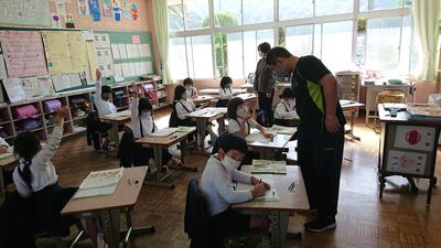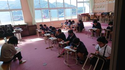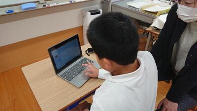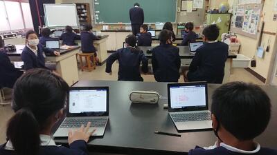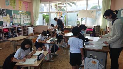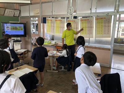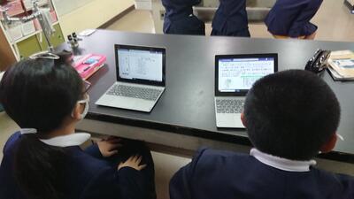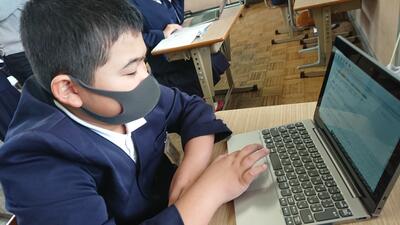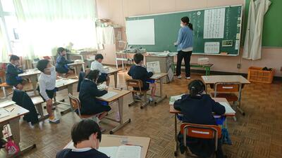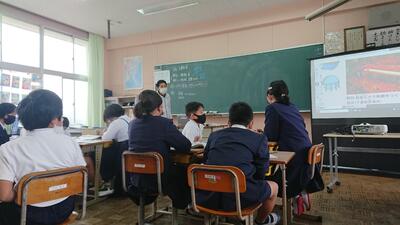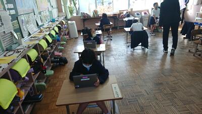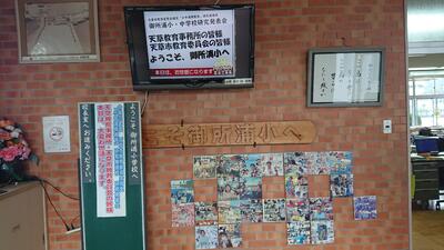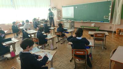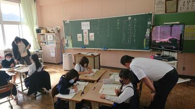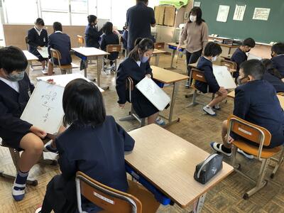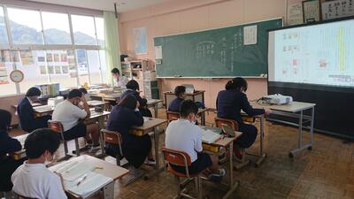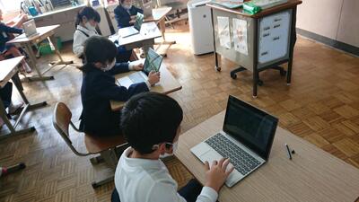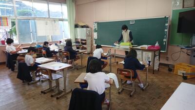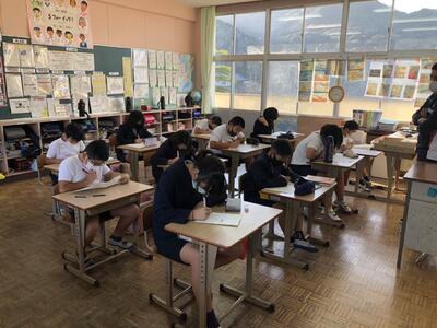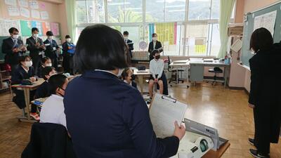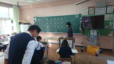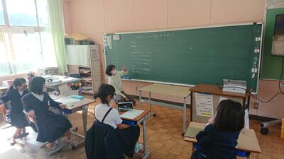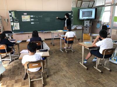 今日は、天草市教育委員会の先生、御所浦中学校の先生、東京からの学生さん(キャラバン隊)が来校されました。2時間目の5年生の国語の授業では、タブレット端末に自分の考えを残しながら、話し合いが行われました。児童は、緊張しながらも話し合いが少しずつ活発になっていく姿が見られました。緊張の中での授業、これも大切な経験です。