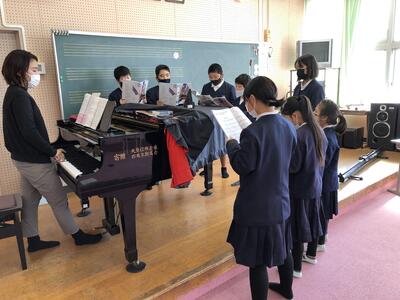 6年生、音楽。甲斐先生の伴奏に合わせて、自然に体を前後に揺らしながら歌っていました。