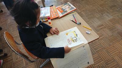 のびのび、国語。はしご車の仕事とつくりを文や挿絵、動画で確認していました。