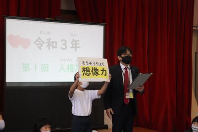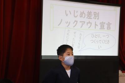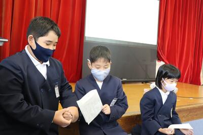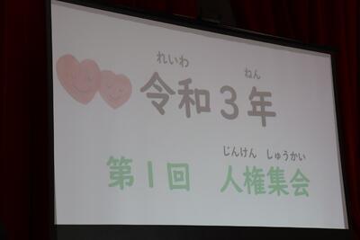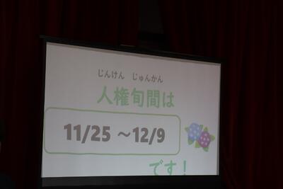 人権集会を行いました。人権主任の先生方からは、「自分のよいところに目を向けてみよう」というお話がありました。その後、縦割り班に分かれ、子どもたちは、友達のよいところをハート型の台紙に書き込んでいたものを手に紹介しました。誰のことが書かれているのか分からない班の友達は、発表を聞きながらドキドキしています。名前が明らかになると、紹介された子は嬉しそうに言葉を交わし、温かな雰囲気が広がりました。子どもたちが体育館を後にしたあとも、会場にはいつもより柔らかく、温かい空気が残っていました。