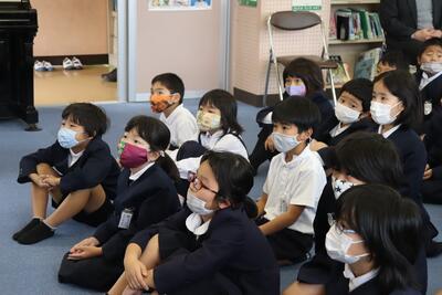 5年生、国語。思わず笑ってしまうようなおはなし(落語:寿限無など)を聞いて、子供たちは落語の魅力に引き込まれていました。