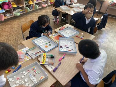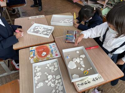 1年生は、いろいろなところの型を紙粘土でとり・・・。