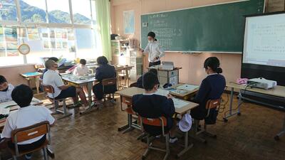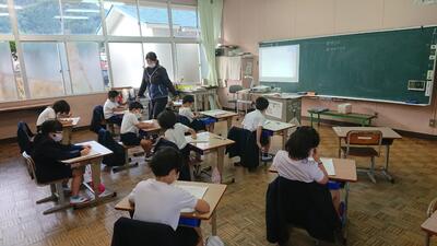 今日は、天草市教育委員会の先生、御所浦中学校の先生、東京からの学生さん(キャラバン隊)が来校されました。2時間目の5年生の国語の授業では、タブレット端末に自分の考えを残しながら、話し合いが行われました。児童は、緊張しながらも話し合いが少しずつ活発になっていく姿が見られました。緊張の中での授業、これも大切な経験です。