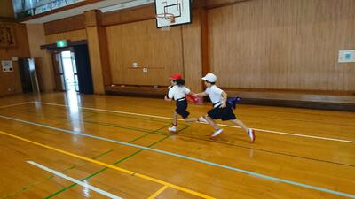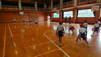 1年生は体育館、鬼ごっこの真っ最中・・・。