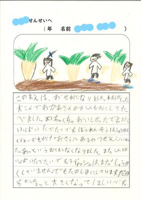 「先生、わたしたちのはたけの大こんやほうれん草がそだつために、はたけをたがやしたり、おくすりをまいたりしてくださって、ありがとうございました。大こんも、ほうれん草も、元気にそだって、しゅうかくもしました。いえにかえっておかあさんに、りょうりをしてもらいました。ゆうごはんになって、おかあさんが、ごはんをはこんでくれました。そして、おみそしるがはこばれてきました。おみそしるを食べようとすると、中にわたしたちがそだてた大こんが入っていました。わたしたちが作った大こんはおいしかったです。ほうれん草ははっぱを食べました。やっぱりおいしかったです。せんせい、おげんきでいてください。」