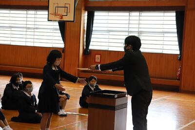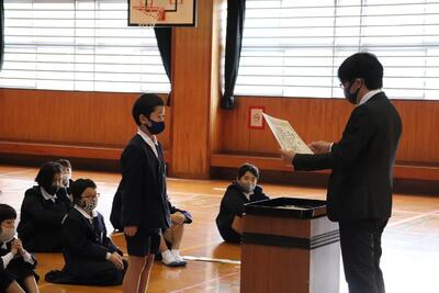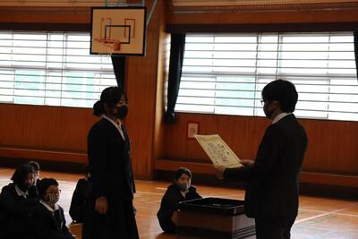 昼休みは1年生と2年生の漢字計算大会の表彰です・・・。