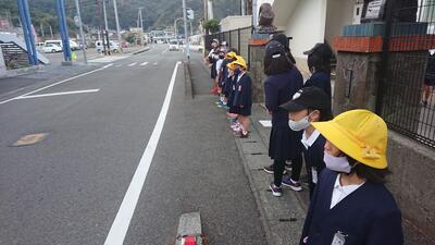 今朝の御所浦小は、御所っ子水族館前でひと騒ぎ・・・。