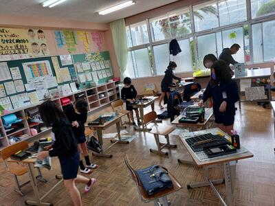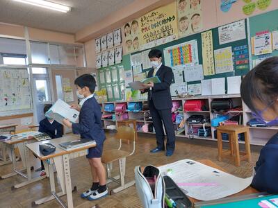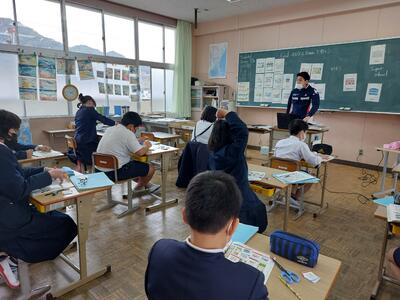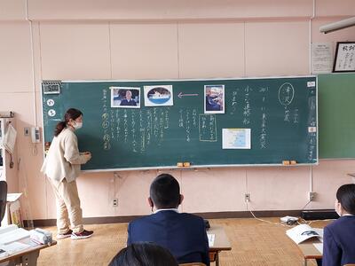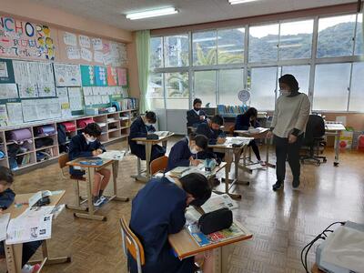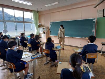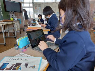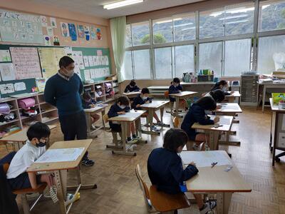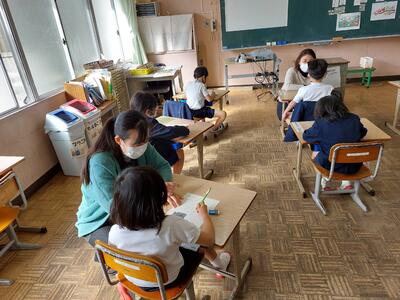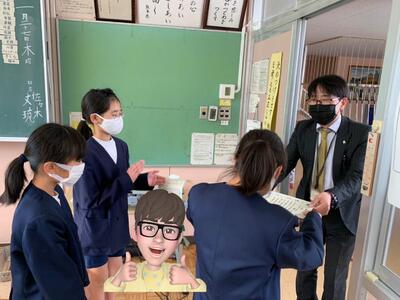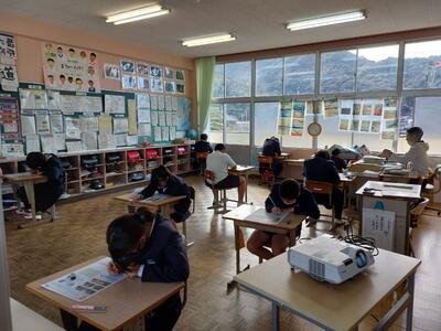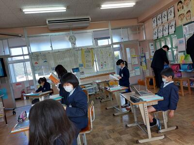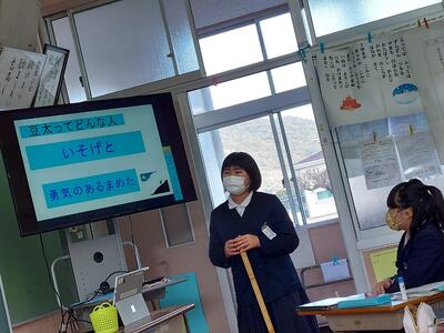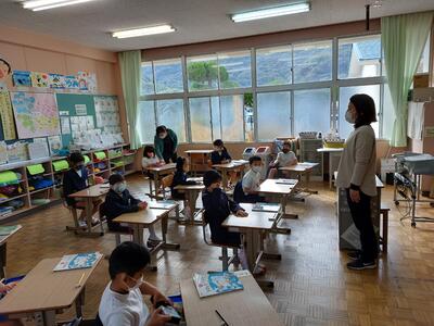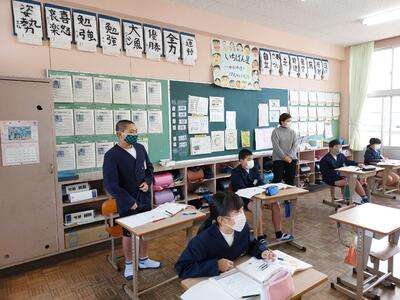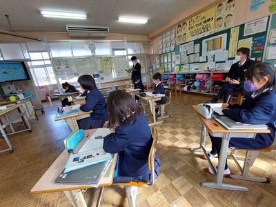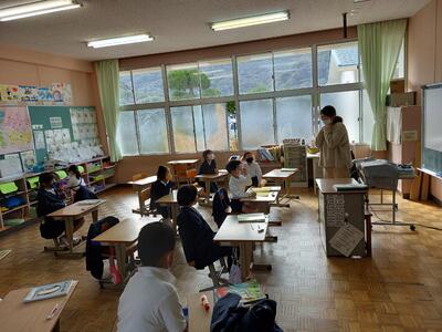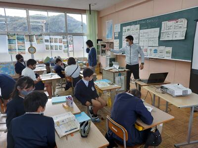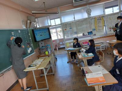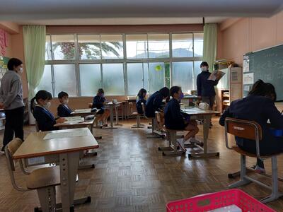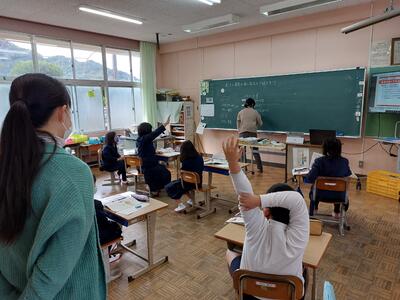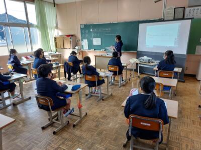 今日は、天草市教育委員会の先生、御所浦中学校の先生、東京からの学生さん(キャラバン隊)が来校されました。2時間目の5年生の国語の授業では、タブレット端末に自分の考えを残しながら、話し合いが行われました。児童は、緊張しながらも話し合いが少しずつ活発になっていく姿が見られました。緊張の中での授業、これも大切な経験です。