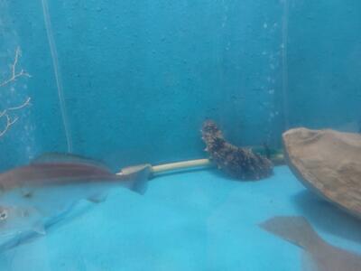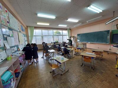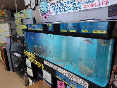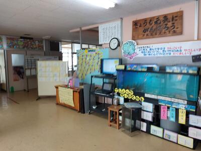 朝から子どもたちに囲まれる「ごしょっこ水族館」。今日も「わあ、きれいになってる!」と声をあげながら、1・2年生の子どもたちが水槽をのぞき込んでいました。昨日の放課後、保護者の方が掃除と海水の入れ替えをしてくださったおかげです。水槽の中では、鯛の稚魚がすくすくと成長しています。