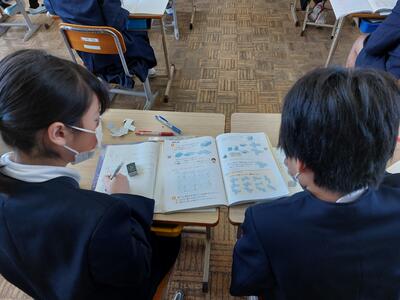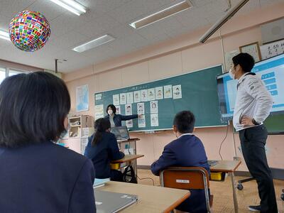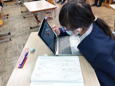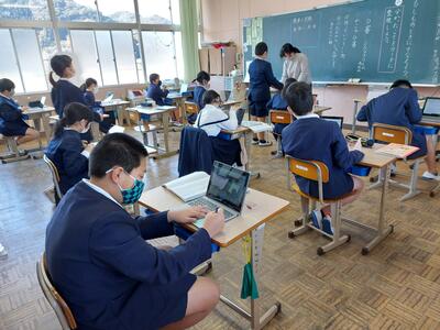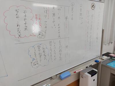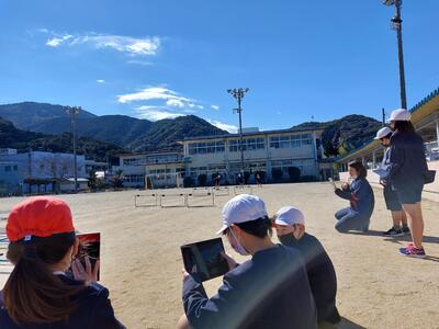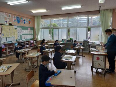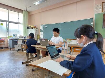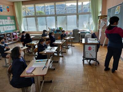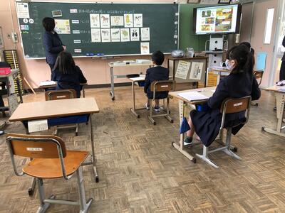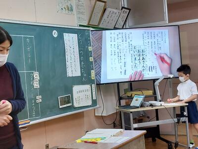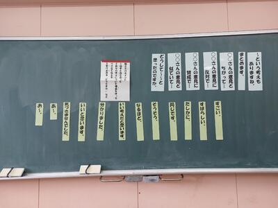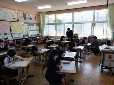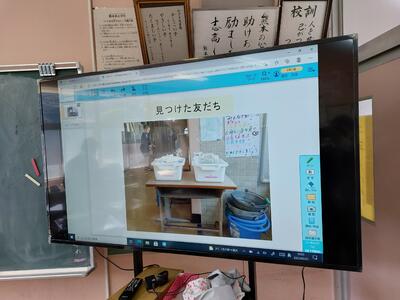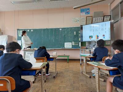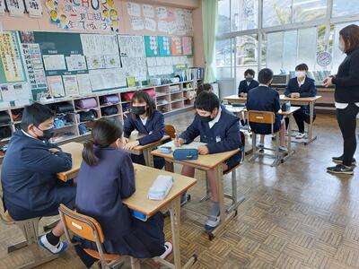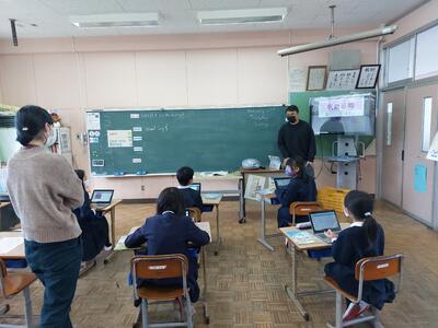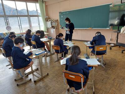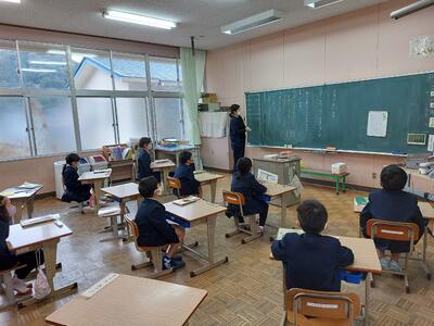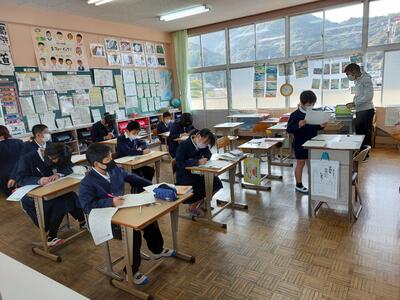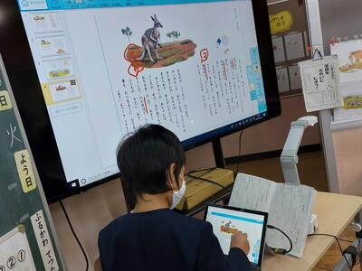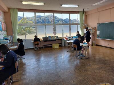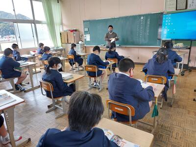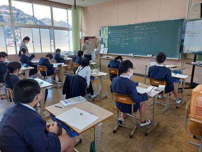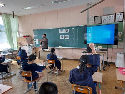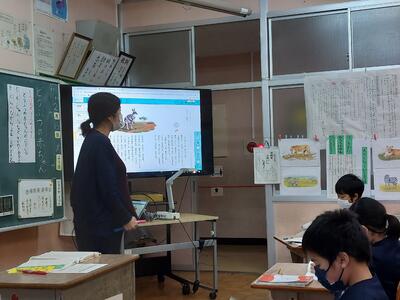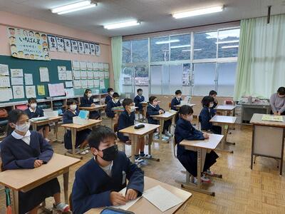 今日は、天草市教育委員会の先生、御所浦中学校の先生、東京からの学生さん(キャラバン隊)が来校されました。2時間目の5年生の国語の授業では、タブレット端末に自分の考えを残しながら、話し合いが行われました。児童は、緊張しながらも話し合いが少しずつ活発になっていく姿が見られました。緊張の中での授業、これも大切な経験です。