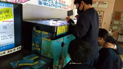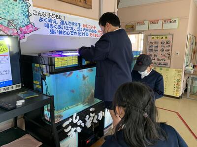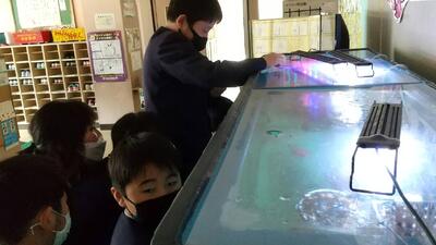 朝から子どもたちに囲まれる「ごしょっこ水族館」。今日も「わあ、きれいになってる!」と声をあげながら、1・2年生の子どもたちが水槽をのぞき込んでいました。昨日の放課後、保護者の方が掃除と海水の入れ替えをしてくださったおかげです。水槽の中では、鯛の稚魚がすくすくと成長しています。