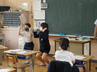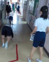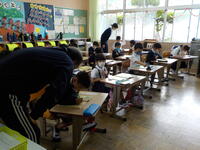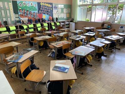 緊急地震速報が校内に響きました。シーンと静まりかえる校内。落下物を想定し、子供たちは頭を守るため、机の下に身を隠します。