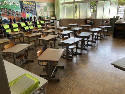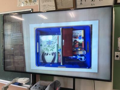 朝タイムの1年生教室。引き出しの中を持ち帰りの部屋(左側)、お泊まりの部屋(右側)と1年生に分かりやすい言葉で確認しています。最初にする約束事って大切です。