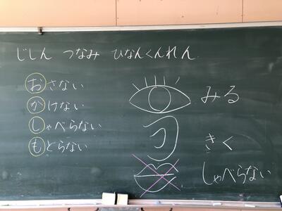 2時間目は、地震津波避難訓練。事前指導後の黒板。