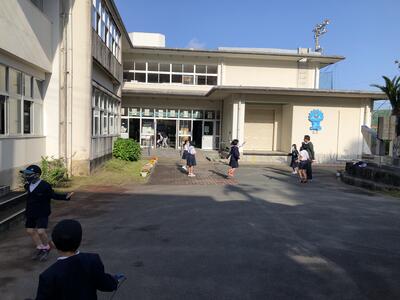 毎日の朝の光景のように思われますが、実は、子供たちが縄跳びをしている奥(昇降口)ですごいことが起きていたのです。私は、見ました!