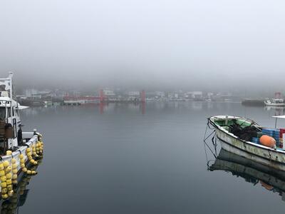 今朝の御所浦は、濃い霧に包まれた、水墨画に出てきそうな幻想的な風景です。