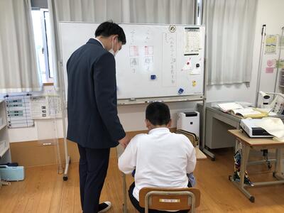 1校時は自立活動で目と体の供応の練習でした。右の指示が出たら右を向く、上の指示が出たら上を向く。それをリズムに合わせて、楽しく動きをつけて行っていました。先生方2人、子どもたち3人が笑顔で活動していました。