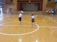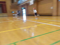 体育館の両端に別れ、走り、出会ったらジャンケン。勝ったら前進、負けたら次の人がスタート!