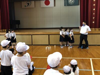 7月8日(火)本校ホールにて、御所浦小学校少年消防クラブの入部式が行われました。天草広域連合御所浦分署から署員3名にご来校いただきました。入部式では、規律訓練や講習も実施され、早速気合いが入った子どもたちです。小さな防災リーダーとして、御所浦の安全を守ってくれることでしょう!