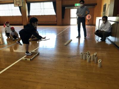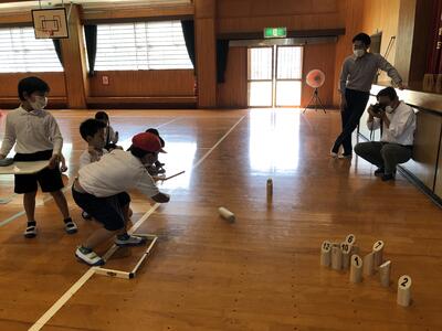 体育館では、2年生が1年生に「モルック」を教えながら一緒に楽しんでいました。「モルック」は、フィンランド生まれのスポーツだということです。このときは、30点をめざしてどの棒を倒したらいいか、何本倒したらいいかをチームで考えながら楽しんでいました。ナイスプレーが何度も見られていました。