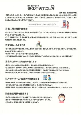 以下の「連休中の過ごし方」のプリントを本日配付しています。各ご家庭でも話題にされてみてください。