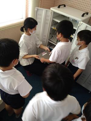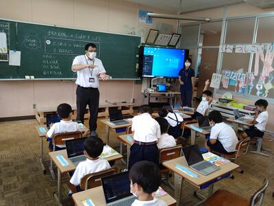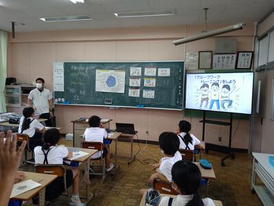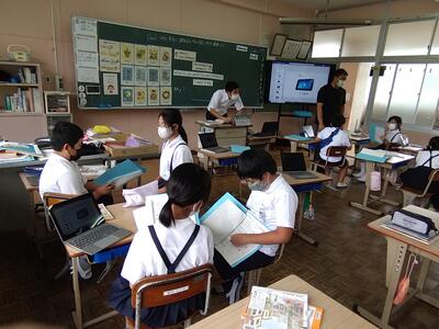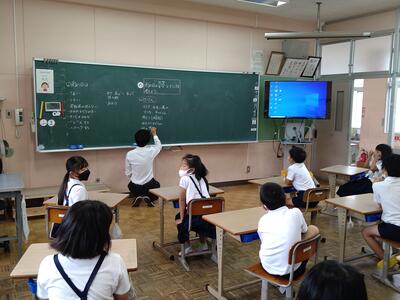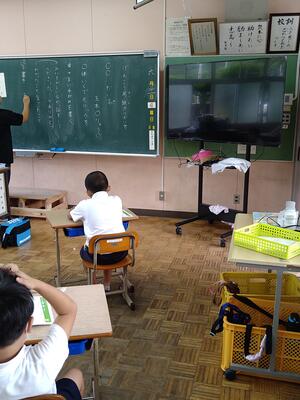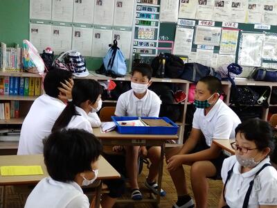 今日は、天草市教育委員会の先生、御所浦中学校の先生、東京からの学生さん(キャラバン隊)が来校されました。2時間目の5年生の国語の授業では、タブレット端末に自分の考えを残しながら、話し合いが行われました。児童は、緊張しながらも話し合いが少しずつ活発になっていく姿が見られました。緊張の中での授業、これも大切な経験です。