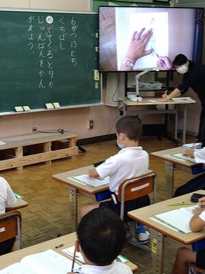 雨でも学習は確実に進んでいきます。1年生の国語の学習です。定規を使ってめあてを線で囲む練習です。1年生でのこのような丁寧な積み重ねが大切ですね。テレビに大きく映してわかりやすく、手の位置や定規の押え方まで声掛けがあっていました。