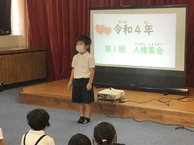 人権集会を行いました。人権主任の先生方からは、「自分のよいところに目を向けてみよう」というお話がありました。その後、縦割り班に分かれ、子どもたちは、友達のよいところをハート型の台紙に書き込んでいたものを手に紹介しました。誰のことが書かれているのか分からない班の友達は、発表を聞きながらドキドキしています。名前が明らかになると、紹介された子は嬉しそうに言葉を交わし、温かな雰囲気が広がりました。子どもたちが体育館を後にしたあとも、会場にはいつもより柔らかく、温かい空気が残っていました。