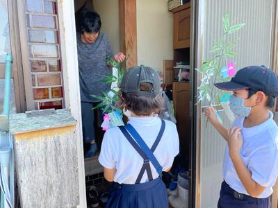 7月の青空の下、3年生以上の子どもたちは、民生委員さん、社会福祉協議会のみなさまと一緒に七夕飾りを一人暮らしの地域の高齢のみなさまに届けて回りました。