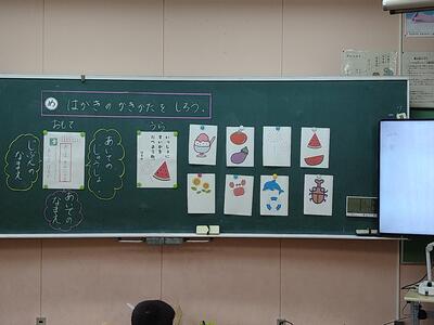 1年生の学習です。「はがきのかきかたをしろう」という題材で、はがきのあてながき、そして絵をていねいに書いていました。