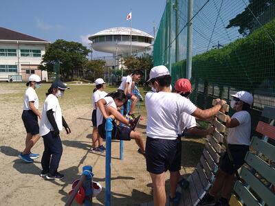 6年生は鉄棒の学習です。足かけ上がり、前方支持回転、後方・・・などいくつかの技を組み合わせます。