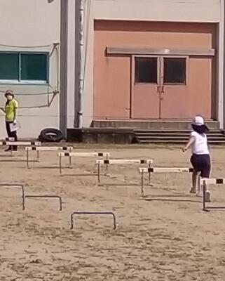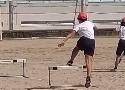 高さとハードルの距離が違う2つのコースを選んで、ハードルをうまく越えるための足抜きの練習です。