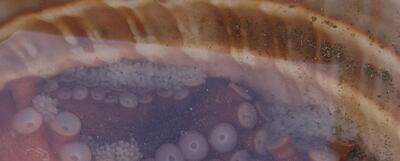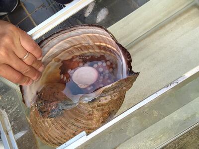 大きな貝殻に、タコが入っています。漁の際にかごに入ったそうです。